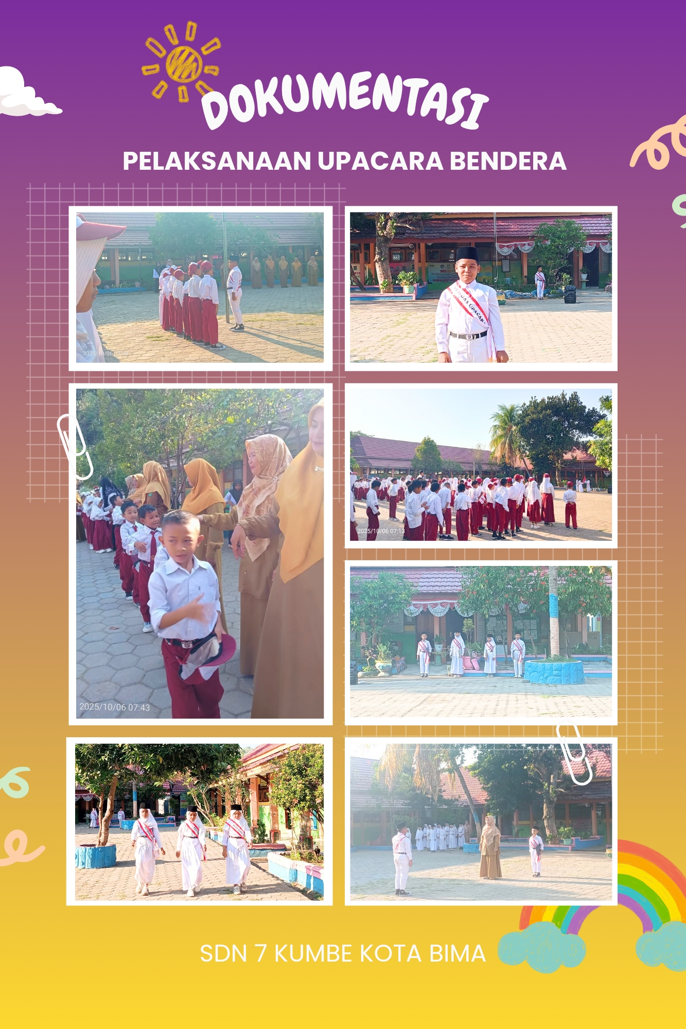 Kota Bima, 06 Oktober 2025 - Upacara bendera Merah Putih merupakan kegiatan rutin yang dilaksanakan setiap hari Senin di SDN 7 Kumbe Kota Bima. Kegiatan ini bertujuan untuk menumbuhkan rasa nasionalisme, disiplin, dan tanggung jawab pada diri peserta didik. Melalui pelaksanaan upacara, siswa diajak untuk menghargai jasa para pahlawan serta memperkuat semangat kebangsaan. Pada kesempatan kali ini, petugas upacara dipercayakan kepada murid kelas 4A sebagai bagian dari latihan kepemimpinan dan tanggung jawab dalam kegiatan sekolah.