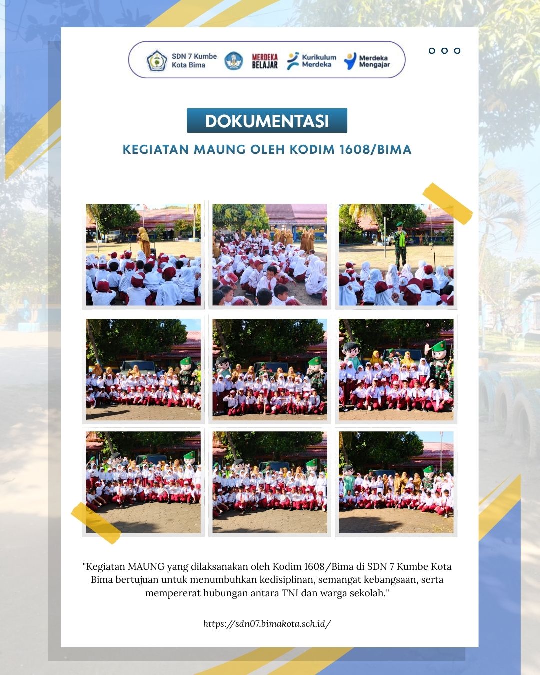 Kota Bima, 06 April 2026 - SDN 7 Kumbe Kota Bima mendapat kunjungan istimewa dari jajaran Kodim 1608/Bima dalam rangka pelaksanaan kegiatan MAUNG yang dipimpin langsung oleh Danpos Rastim, Pelda Ifin S, bersama jajarannya. Kegiatan ini disambut dengan penuh antusias oleh seluruh warga sekolah, khususnya para siswa.