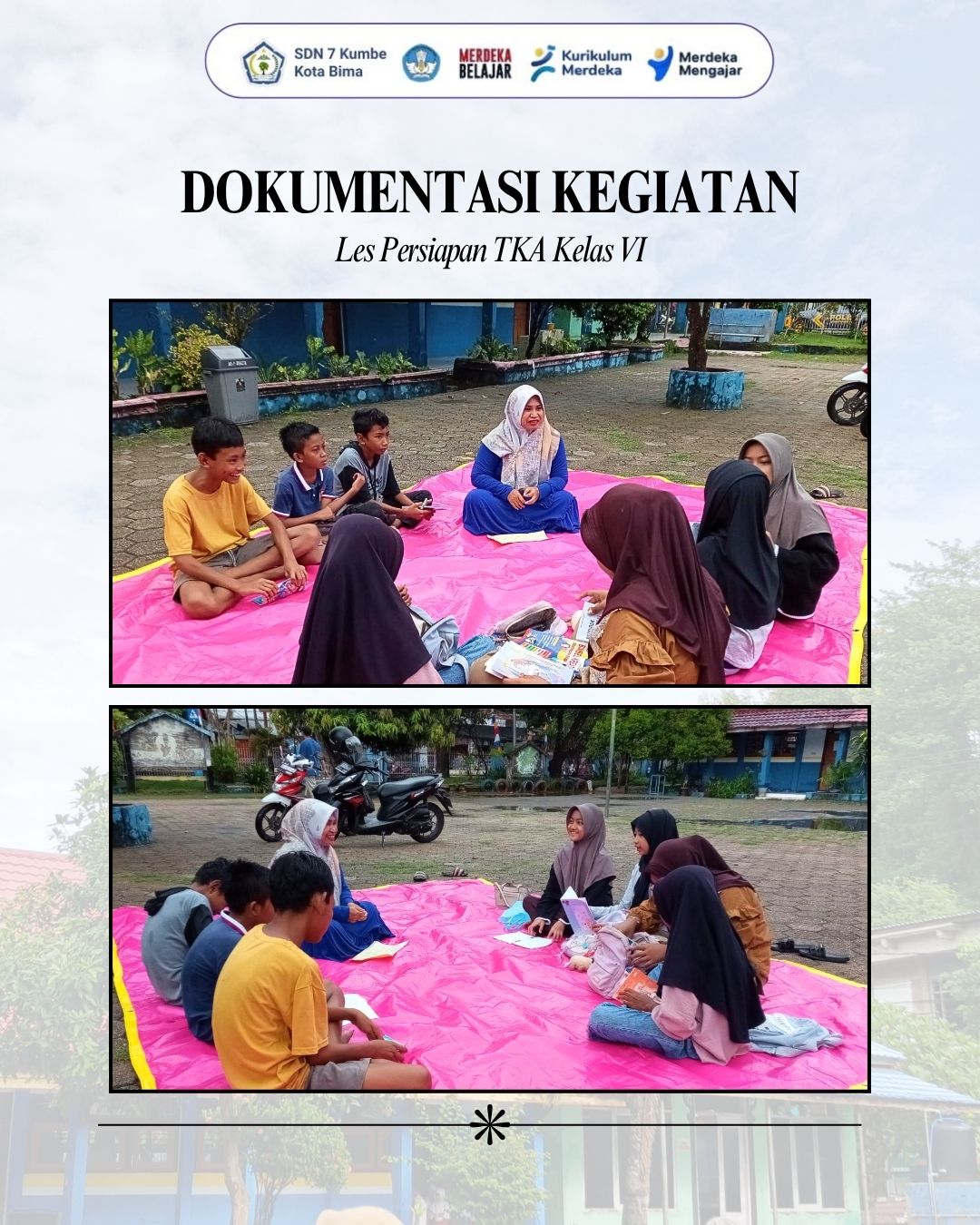 Kota Bima - SDN 7 Kumbe Kota Bima melaksanakan kegiatan les tambahan sebagai bentuk persiapan menghadapi Tes Kemampuan Akademik (TKA) bagi siswa kelas VI A dan VI B. Kegiatan ini dilaksanakan di lingkungan sekolah dengan tujuan untuk membantu siswa memperdalam pemahaman materi pelajaran yang akan diujikan.