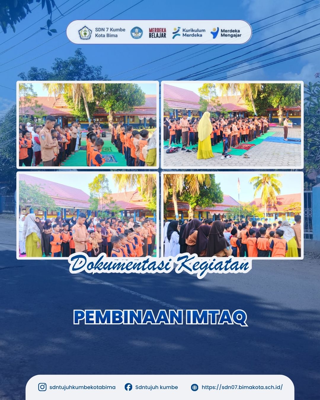 Kota Bima - SDN 7 Kumbe Kota Bima telah melaksanakan kegiatan pembinaan Iman dan Taqwa (IMTAQ). Kegiatan pembinaan IMTAQ merupakan kegiatan rutin yang dilaksanakan setiap hari Jum'at sebelum memulai kegiatan belajar dan mengajar. Pada kegiatan IMTAQ diawali dengan pelaksanaan sholat dhuha berjamaah. Seluruh siswa melaksanakan shalat dhuha berjamaah di halaman SDN 7 Kumbe Kota Bima dan dilanjutkan dengan berdzikir bersama. Kegiatan ini di pandu oleh guru Pendidikan Agama Islam.