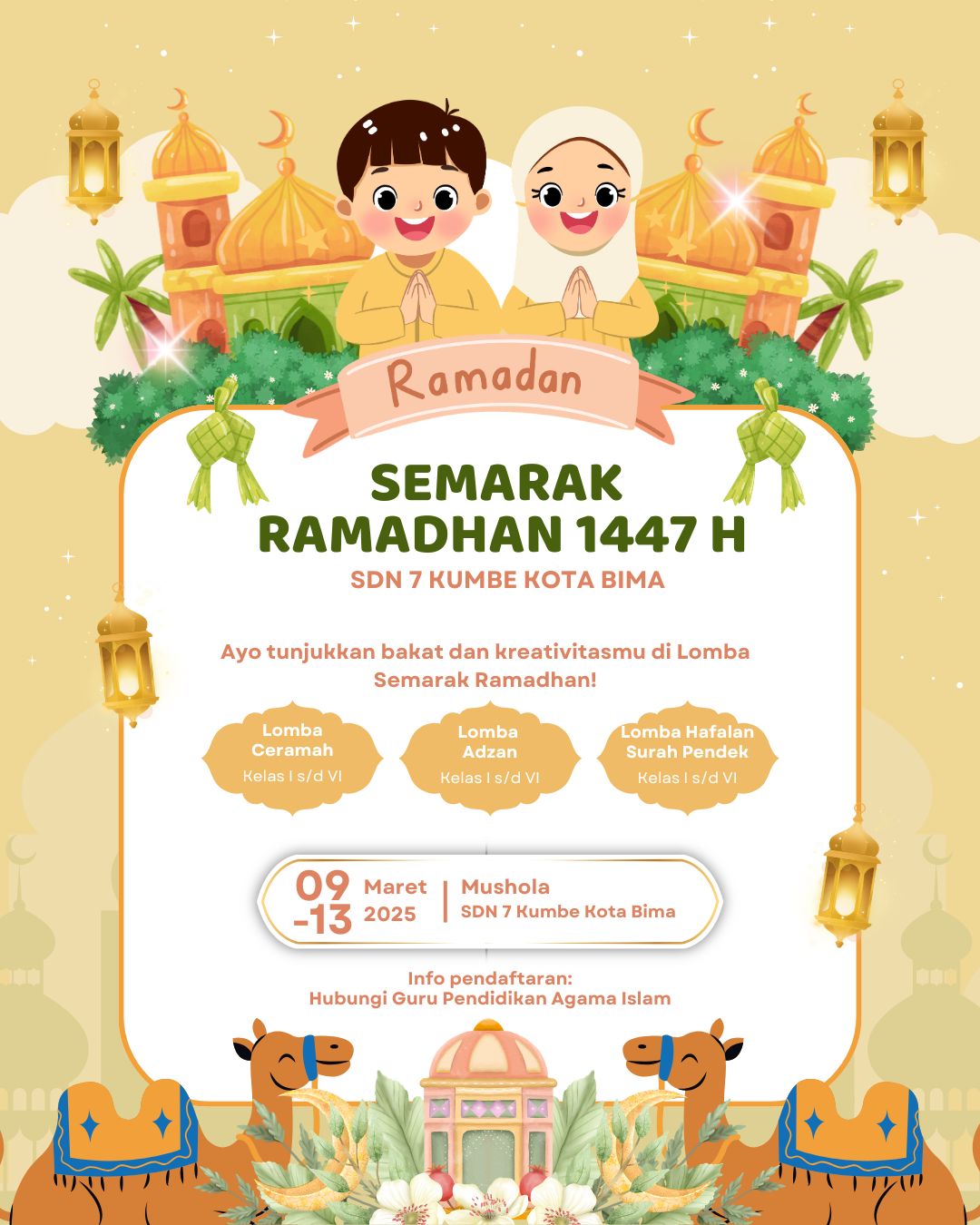 Dalam rangka memeriahkan bulan suci Ramadhan, SDN 7 Kumbe Kota Bima akan mengadakan Lomba Semarak Ramadhan yang dilaksanakan pada minggu terakhir kegiatan sekolah di bulan Ramadhan. Kegiatan ini menjadi momen untuk menumbuhkan semangat kebersamaan, kreativitas, serta meningkatkan nilai-nilai keagamaan pada peserta didik.